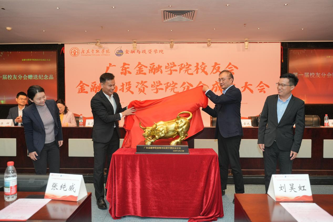 大会还举行了太阳成集团tyc122ccvip员工分会赠送礼物仪式,由公司工会副主席、党委办公室主任范宜波和员工处处长容志豪共同为礼物揭开红幕。太阳成集团tyc122ccvip员工分会向母校赠送一尊华尔街铜牛雕塑,寓意金融报国、砥砺前行,祝福母校事业根基稳固、蒸蒸日上。