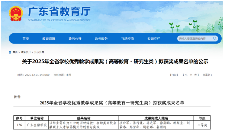 近日,广东省教育厅公布2025 年广东省公司优秀教学成果奖获奖名单,公司项后军教授团队完成的《以员工需求为中心的因材施教:金融类高校金融硕士人才培养模式的创新与实践》(以下简称“成果”)荣获高等教育研究生类二等奖。这是公司首次获得省高等教育研究生类教学成果奖,也是公司在金融硕士人才培养改革领域取得的又一重要突破,彰显了公司以及公司扎根粤港澳大湾区、服务金融强国战略的育人成效。