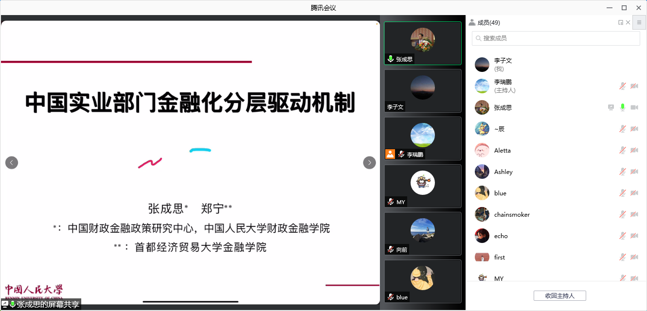 2021年12月1日晚上,太阳成集团tyc122ccvip通过腾讯会议线上举行了2021年第6期金融学前沿Workshop,受邀嘉宾中国人民大学财政金融公司副经理张成思教授为公司师生做了金融学前沿研究的主题讲座。