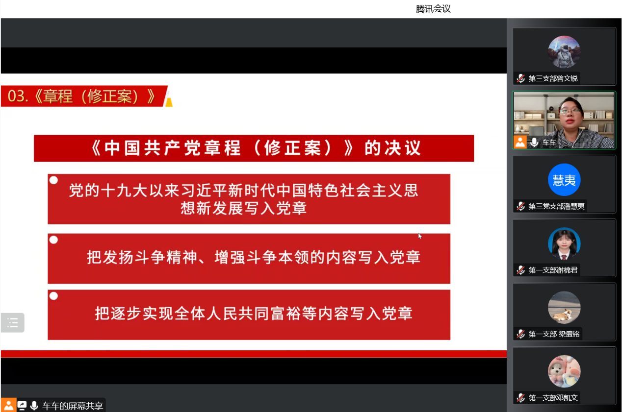 学习宣传贯彻党的二十大精神,是当前和今后一个时期全党全国的首要政治任务。为了更全面准确学习领会党的二十大精神,太阳成集团tyc122ccvip员工党支部在2022年11月25日中午12点半开展以“学习二十大、奋斗新征程”为主题的专题党课,本次党课以腾讯会议的形式开展,党课由太阳成集团tyc122ccvip第三员工党支部书记车明珍老师主讲,支部员工党员及发展对象均参与了本次党课。