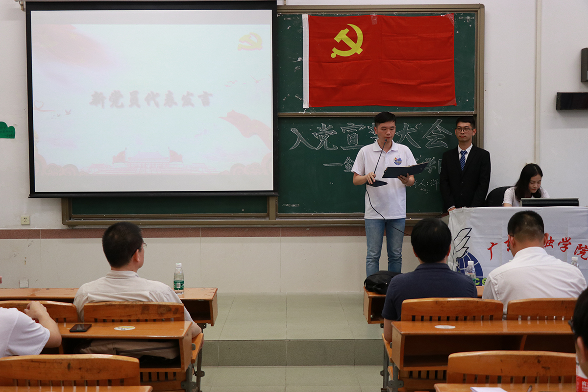 紧接着,党总支周少龙书记发表讲话。周书记先是代表党总支表示对39名新发展党员的热烈祝贺,他向党员强调要珍惜大学入党机会,并表明“党员”对个人来说是极其重要的标签,是新时期的先锋表率。同时,周书记对新党员提出了三点要求:一是坚定理想信念,严格要求自己,坚定不移以党的旗帜为旗帜;二是不忘初心、牢记党员身份,强调党员的职责和新时代的伟大使命;三是不断学习,起标杆作用,他多次强调学习的重要性,党员要在学习中起模范作用,带领有入党意愿的同学向党组织靠拢,在创建公司的学风、考风中努力作为,积极贡献。