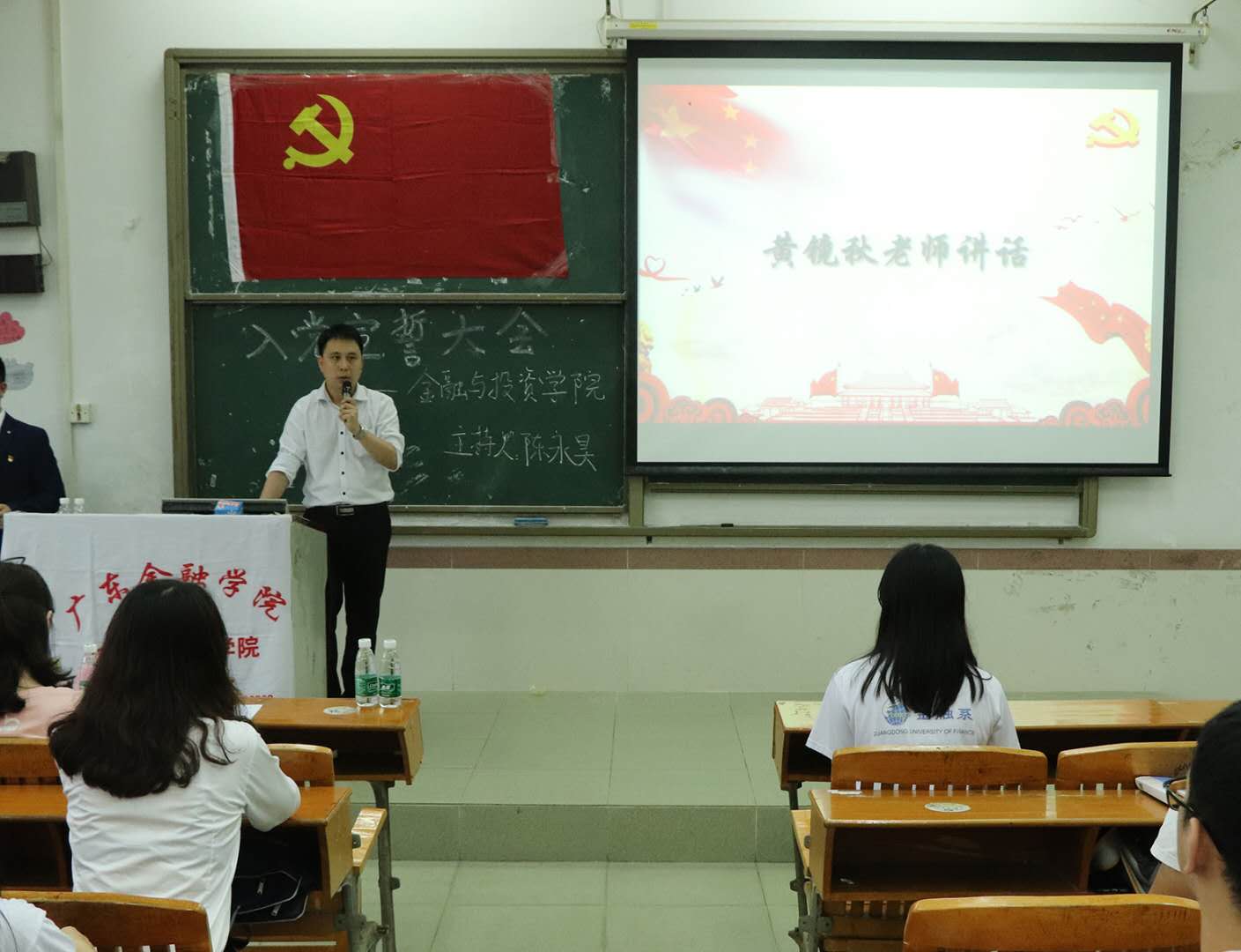 紧接着,第一党支部书记黄镜秋老师发表讲话,黄老师先是代表党总支表示对53名新发展党员的热烈祝贺,并强调在五四运动100周年这个具有特殊意义的历史时刻,作为实现中华民族伟大复兴的先锋力量,中国青年要有担当意识、责任意识、创新意识和忧患意识。同时,黄老师对新党员提出三点要求:一是要勤学知识、苦练本领,以真才实学服务人民;二是要勇于砥砺奋斗,勇做走在时代前列的开拓者,用青春和汗水贡献国家;三是要热爱祖国,紧随党的步伐,让爱国主义旗帜始终在心中高高飘扬。
