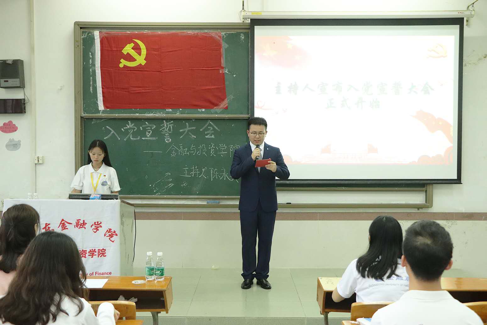随后,新发展的党员参加了入党宣誓大会。庄严宣誓之后,预备党员代表余君里同学进行了发言,他激动地分享了此刻宣誓的感受,并强调现阶段党员不仅要从组织上入党,还要从思想上、行动上入党,充分发挥党员的先锋模范作用。接着,16级党员代表陈佳娜同志发言,她表示作为一名党员,要严格要求自己,积极用好“学习强国”学习平台,加强专业知识学习,要理论联系实际,积极投身社会建设。