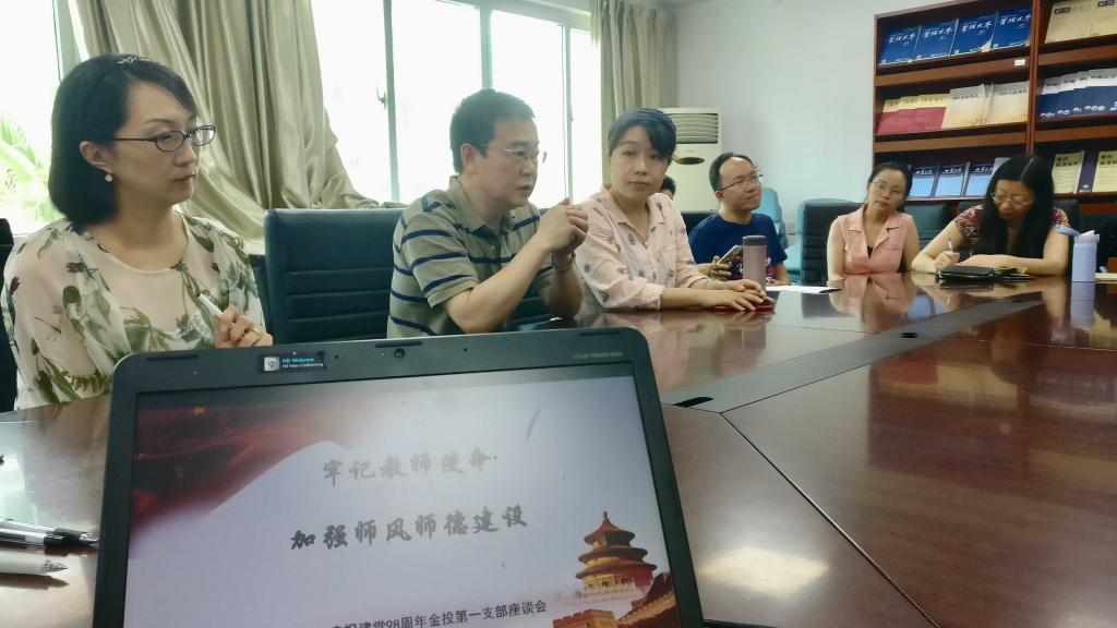 为了响应习主席提出的"不忘初心、牢记使命”主题教育活动,把学习宣传贯彻党的十九大精神与实际工作紧密结合起来,真正把党的十九大精神转化为扎实前行的强大动力,在建党98年之际,金投公司第一教工支部结合教师的工作性质举行了“牢记教师使命,加强师风师德建设”为主题的民主生活座谈会,以实际行动号召党员教师们以身作则,为人师表,带头加强公司的师风师德建设。