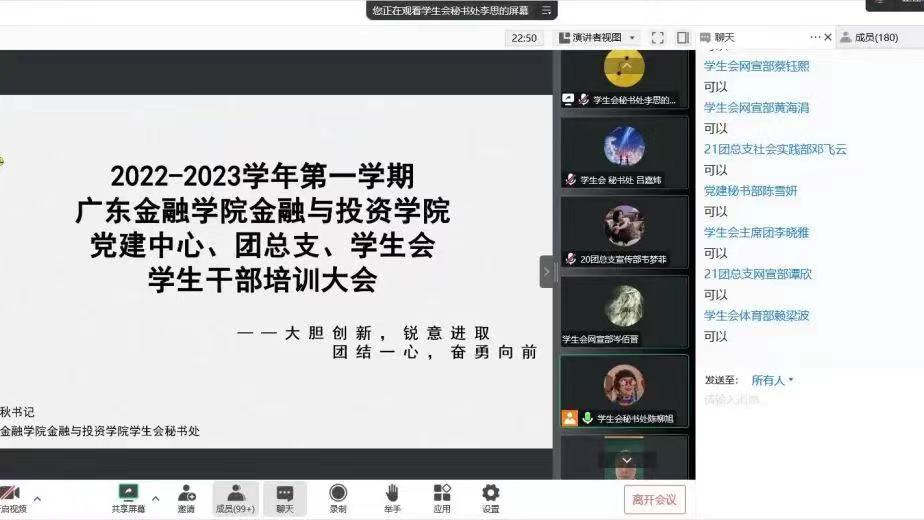 为了进一步提高公司员工干部的综合素质,增强自我教育、自我管理、自我服务的意识,切实提高干部的工作能力和工作效率,太阳成集团tyc122ccvip于2022年10月17日在线上召开2022-2023学年第一学期党建办公室、团总支、员工会员工干部培训,本次培训由太阳成集团tyc122ccvip黄镜秋副书记主讲。