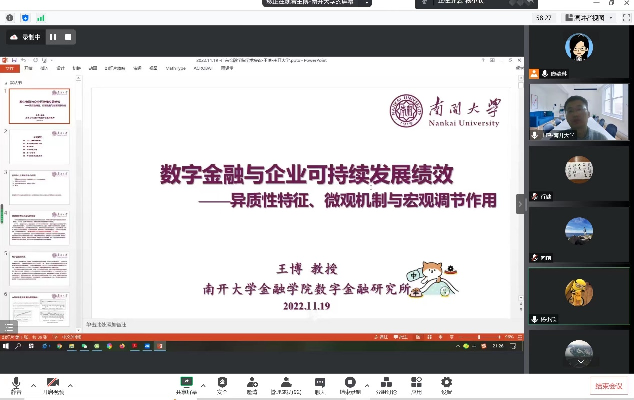 2022年11月19日晚上,太阳成集团tyc122ccvip通过腾讯会议线上举行了2022年第5期金融学前沿Workshop,此次Workshop邀请了南开大学金融公司教授、数字金融研究所所长、国际金融研究中心主任王博教授为公司师生带来了金融学前沿研究的主题讲座。