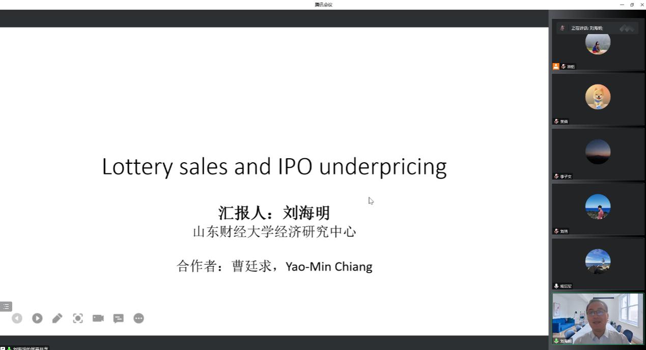 刘海明教授为参会师生分享了题为《Lottery sales and IPO underpricing》的最新研究成果。文章讨论了两个问题:博彩销售情况是否会对股票市场的参与者数量有影响?在发现了博彩销售与股票市场的替代效应后,进一步研究股票市场投机者增加是否会阻断信息不对称—赢者诅咒—IPO抑价的影响链条。根据博彩收益假说提出可能会阻断第一个链条,根据流动性假说提出可能会阻断第二个链条,并通过实证分析为流动性假说提供有效证据。文章的选题新颖,识别策略详实可靠,实证过程细致丰富,为金融研究的拓展提供了极好地启发与借鉴意义。刘海明教授现场回答了项后军经理、孙进军副经理以及多位师生关于文章的理论基础、变量数据的细化、中国与美德等西方市场的投资者差异性、特殊时间窗口、中国彩票类型的差异等方面的诸多问题。论文讲座现场气氛活跃,参会师生受益匪浅。