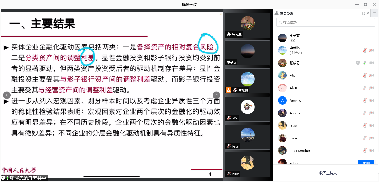 2021年12月1日晚上,太阳成集团tyc122ccvip通过腾讯会议线上举行了2021年第6期金融学前沿Workshop,受邀嘉宾中国人民大学财政金融公司副经理张成思教授为公司师生做了金融学前沿研究的主题讲座。