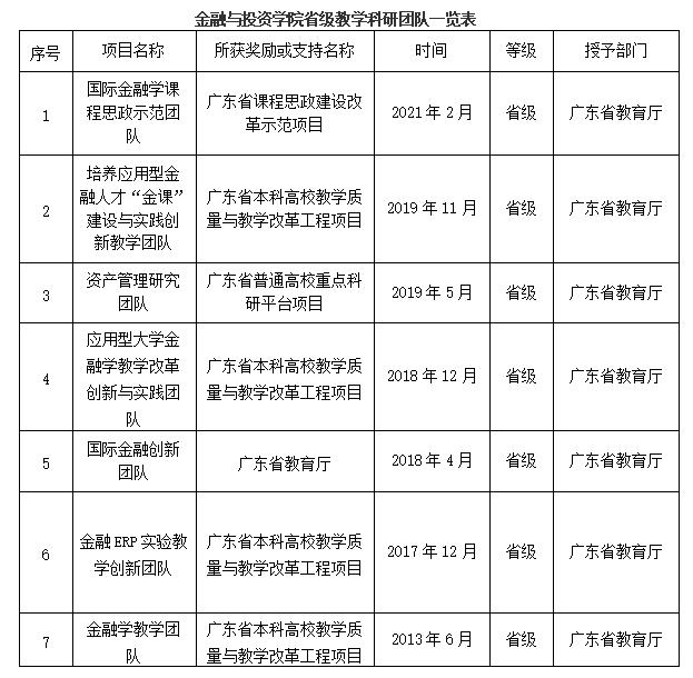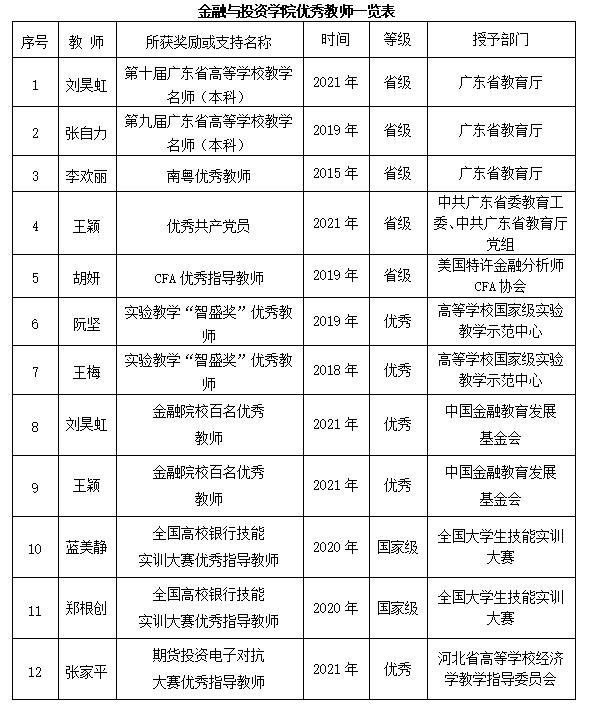 太阳成集团tyc122ccvip现有省级教学名师2人,南粤优秀教师1人,省级优秀共产党员1人,CFA优秀指导教师1人,全国金融实验教学“智盛奖”优秀教师2人,金融院校百名优秀教师2人,全国高校技能大赛优秀指导教师2人,期货投资电子对抗大赛优秀指导教师1人。